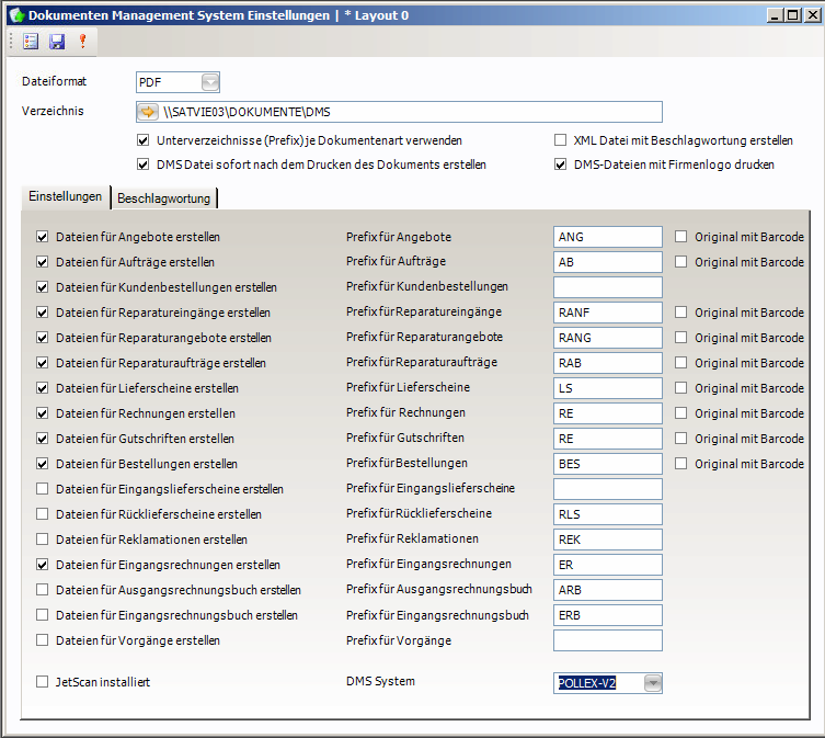 Dokumente werden beim Ausdruck automatisch an das DMS übergeben. Dazu muss in Grundlagen – Dokumenten Management System ein Verzeichnis angegeben werden, in dem die PDF Dokumente aus dem ERP abgelegt werden, bevor diese in das DMS übergeben werden.