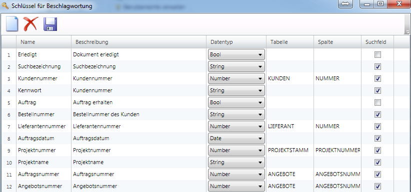 Spalte Suchfeld definiert, ob dieses Feld für die Dokumentensuche zur Verfügung steht. Ist Tabelle und Spalte eingetragen, so wird ein Suchfenster aus dem ERP bei der Dokumentensuche zur Verfügung gestellt.
