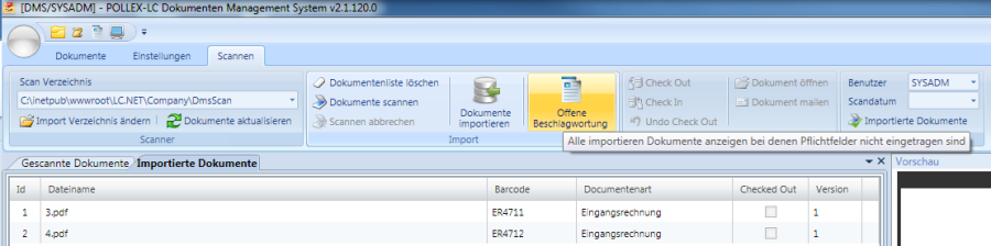 Mit dem Befehl „Offene Beschlagwortung" werden alle importierten Dokumente angezeigt, deren Pflichtfelder der Beschlagwortung noch nicht ausgefüllt wurden.