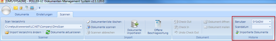 Die Befehle im Bereich der „Historie" ermöglichen Zugriff auf alle bisherigen Importe aller Benutzer. Somit können bei Absenz eines Anwenders auch andere Anwender dessen Importe fertig beschlagworten.