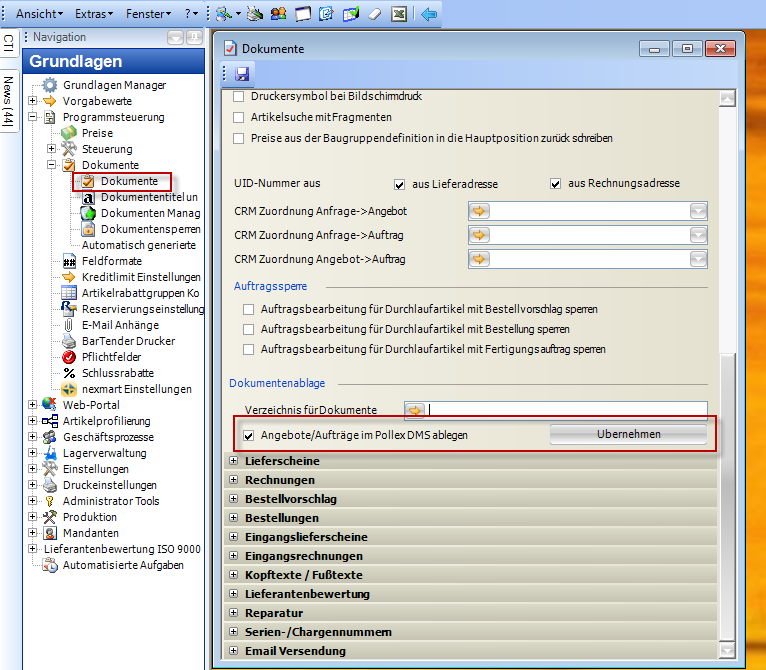 Für jedes mx.Dokument gibt es einen eigenen Grundlagenschalter, mit dem die Ablage im mx.DMS aktiviert werden kann. Zusätzlich gibt es jeweils eine Schaltfläche, mit der die Übernahme der Dokumenten Explorer Dateien in das DMS erfolgen kann.