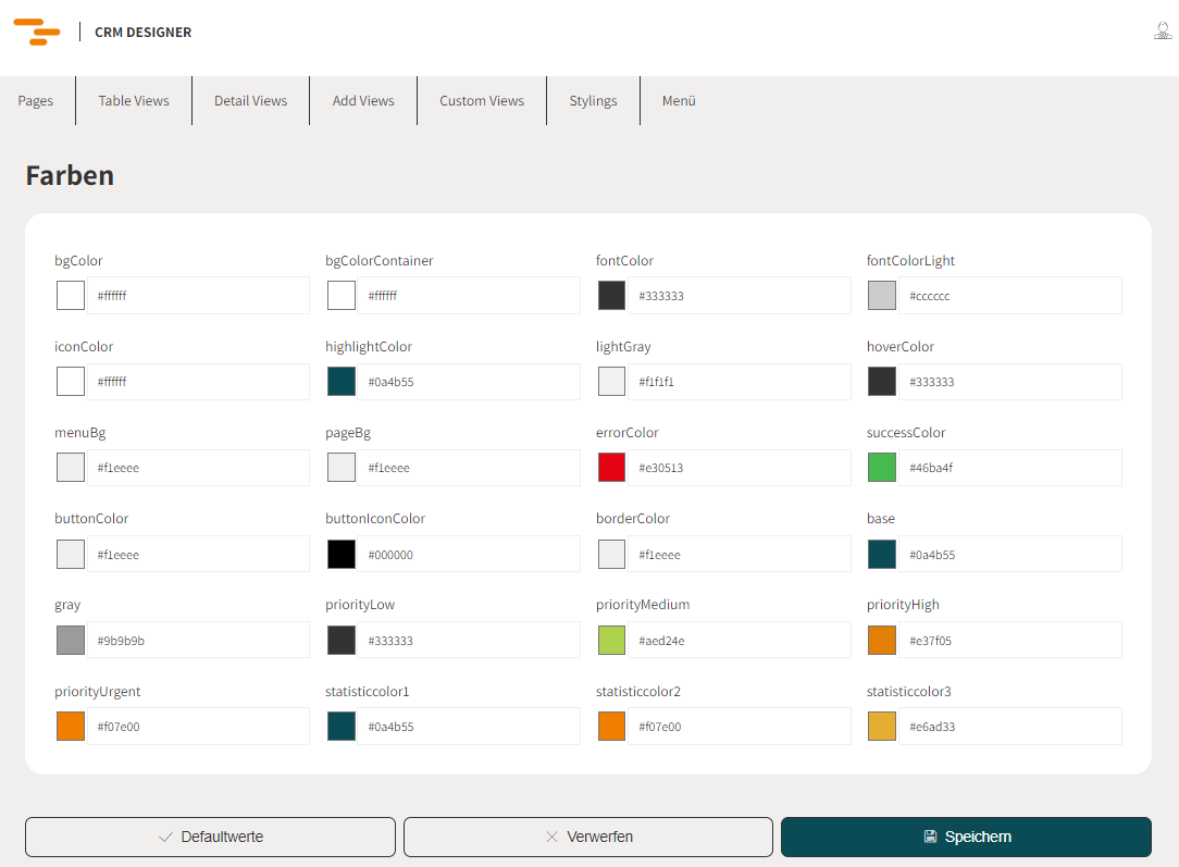 Durch diese Farbänderungen werden die CSS Variablen im CRM überschrieben. Wenn man also eine neue Variable braucht, muss man diese sowohl im CRM, als auch im Designer (mit gleichem Namen) hinzufügen.