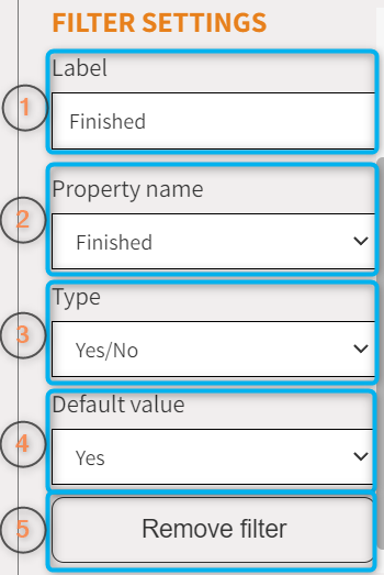 - Auswahlfeld des Filter Typen. Zur Auswahl stehen Ja/Nein, Datum, Nummer und Text.