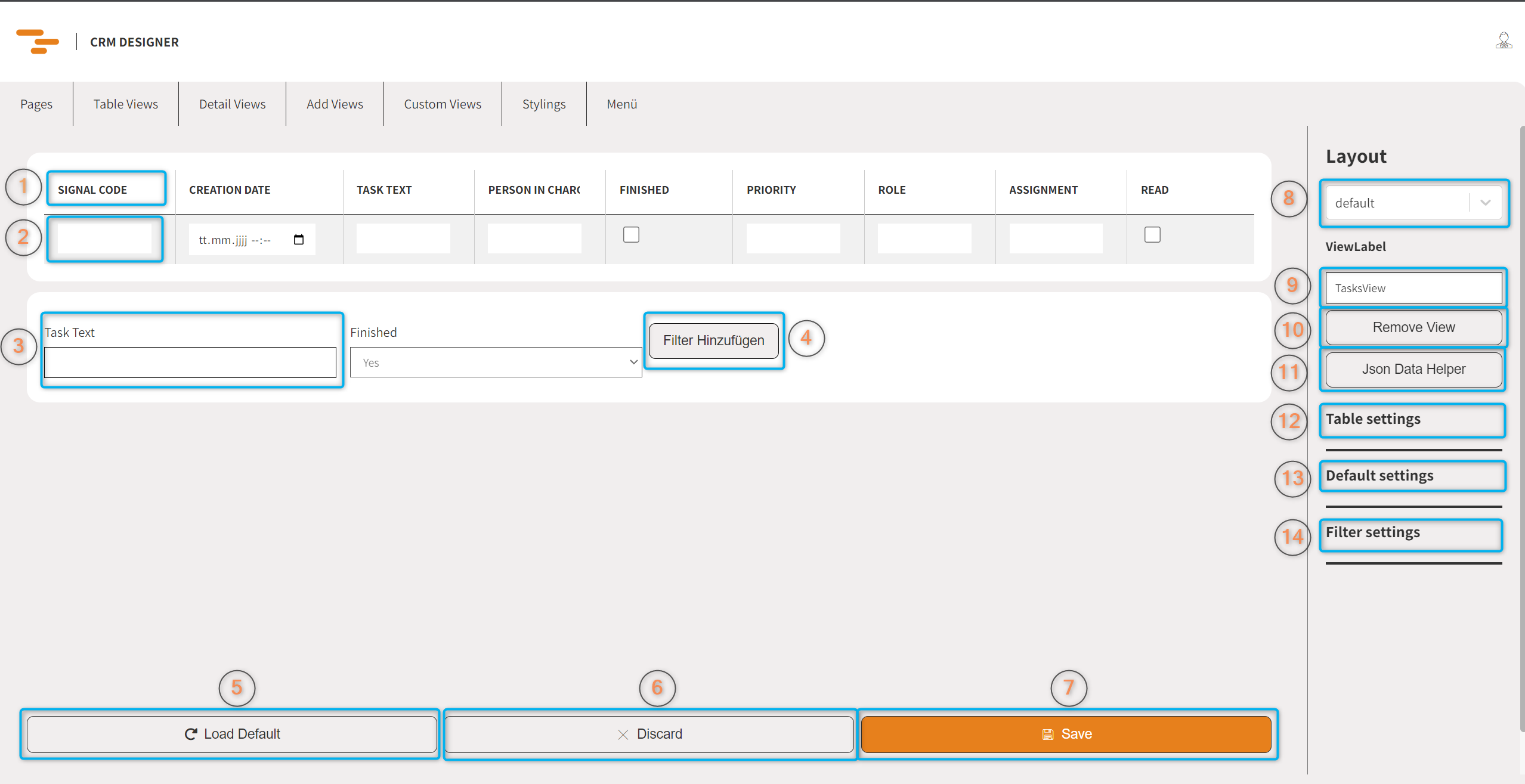- Text Eingabefeld um zusätzliche Standard Filter anzugeben, welche nicht unbedingt etwas mit den normalen Filtermöglichkeiten zu tun haben. Dieser Filter wird immer verwendet bei diesem Tabellenlayout und kann nicht im CRM überschrieben werden.