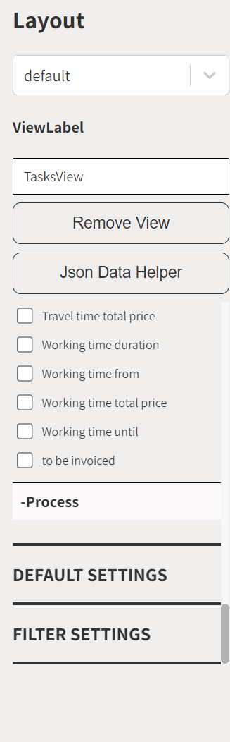 - Auswahl des Layouts. Jede View hat ein zumindest ein Default Layout. Man kann weitere Layouts anlegen indem man auf die Auswahl klickt, den Namen des neuen Layouts eintippt und auf "Create (Eingegebener Name)" klickt. Ein neues Layout startet automatisch mit den Default Einstellungen in den JSONs. In den Page Einstellungen (Designer → Seiten/Pages) kann man das Layout auswählen welches man im CRM anzeigen will.