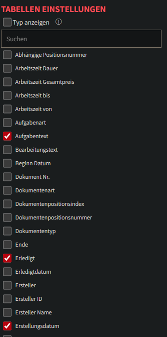 Wenn man auf die Table Einstellungen klickt wird eine Liste an Checkboxen ausgeklappt. Die Checkboxen stellen alle zur Auswahl möglichen Tabellen Spalten dar. Durch das anhaken/aushaken der jeweiligen Checkbox wird die jeweilige Variable zur Tabelle hinzugefügt bzw. entfernt. Die Checkboxen werden des weiteren zur besseren Übersicht in Aufklappbare Objekte unterteilt (Siehe Grafik 2 -Process).