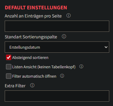 - Checkbox welche erscheint sobald eine Standard Sortierungs-Spalte ausgewählt wurde. Wenn angehakt wird nach der Spalte absteigen sortiert.