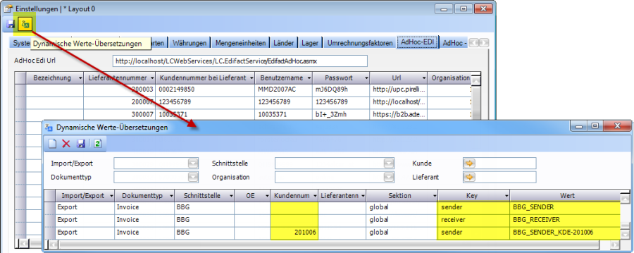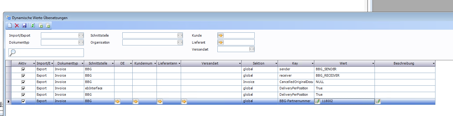 Bei der Übertragung mithilfe von BBG kann es nötig sein, dass weitere Werte wie zum Beispiel eine „Sender-Identifikation" oder „Receiver-Daten" angegeben werden müssen. Dies kann im Fenster Dynamische Werte-Übersetzungen geschehen. Das Fenster wird über das Symbol Dynamische Werte-Übersetzungen im Fenster Einstellungen (Edifact) geöffnet.