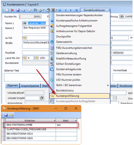 Über die Kundenprofilierung wird ein Feld „BBG-PARTNERNUMMER" definiert. Tragen Sie bei jedem Kunden, der BBG-Partner ist, die Partnernummer ein: