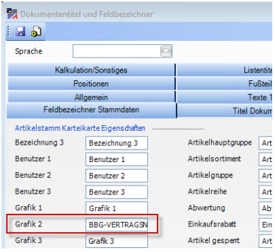 | BBG-Vertragsnummer (BBG-GZ) | Wird je Artikel bestimmt und im Feld eb:ListLineItem.AdditionalInformation.Classification @ ClassificationSchema="BBG-GZ" übermittelt. Es können dafür die Felder „Benuter1-3" bzw. „Grafik1-3" verwendet werden. Welches Feld Sie dafür verwenden, können Sie selbst entscheiden und wird weiter unten erläutert. |