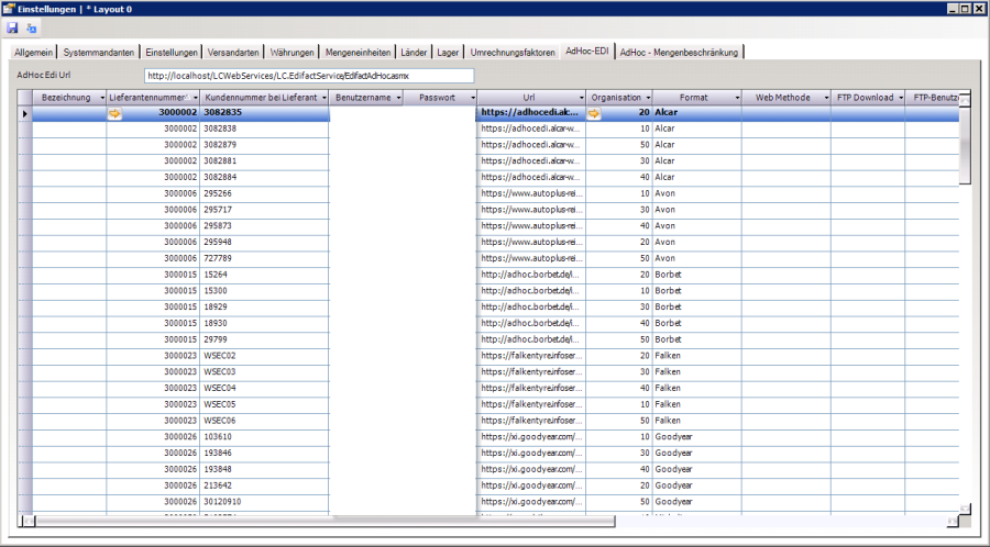 Die Zugangsdaten sind in den Edifact-Einstellungen zu hinterlegen. Das Fenster findet sich in der Navigation unter Zusatzprogramme, Knoten Edifact. Öffnen Sie das Fenster Einstellungen und navigieren zur Karteikarte AdHoc-EDI.