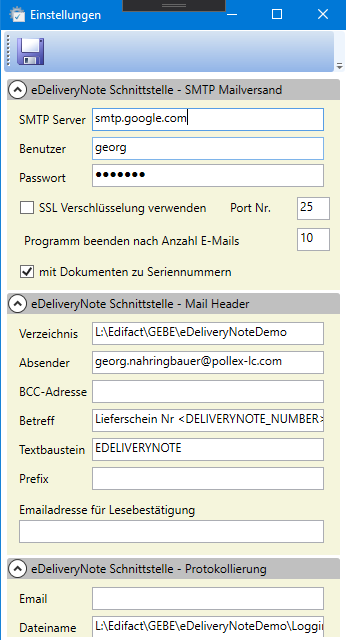 SMTP Server, Benutzer und Passwort beziehen sich auf den Absender der E-Mail mit dem Lieferschein.