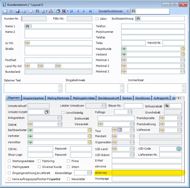Die E-Mail Adressen müssen, um den eDeliveryNote Versand zu ermöglichen, im Kundenstamm hinterlegt werden. Dies geschieht im Feld eDelivery.