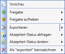 Freigabe | Auswahl: Alle Datenätze und Selektierte Datensätze Dieser Menüpunkt setzt die Freigabe für alle Datensätze oder aber nur für den/die selektierten Datensatz/-sätze. Dieser Menüpunkt ist bei bereits freigegebenen Rechnungen inaktiv. Eine Rechnung kann bereits beim Einfügen als freigegeben markiert sein, wenn die Grundlageneinstellung „Automatische Freigabe für Export (Warteschlange)" aktiviert ist oder die markierte Rechnung bereits manuell freigegeben wurde. |