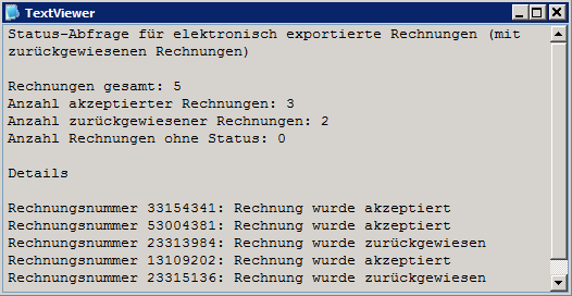 Akzeptiert-Status abfragen | Auswahl: Alle Datenätze und Selektierte Datensätze Beim Betätigen der Abfrage nach dem Akzeptiert Status wird ein Textfenster geöffnet in welchem der Staus zu jeder abgefragten Rechnung ersichtlich ist.