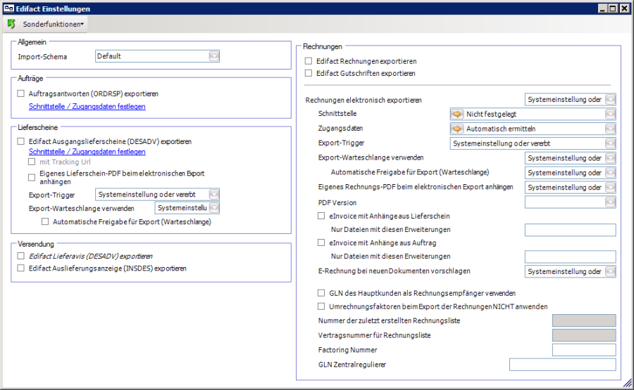 Warteschlange für den Rechnungs-Export verwenden | Mit dieser Einstellung wird gesteuert, ob eine Rechnung bei Auslösung des elektronischen Versands sofort versendet werden soll (Kontrollkästchen aktiviert), oder in die Warteschlange eingetragen wird. Ist die Einstellung aktiviert, so wird die Rechnung in die Warteschlange eingetragen, ist sie deaktiviert, wird das Dokument sofort versandt. Diese Einstellung kann pro Kunde in den Edifact-Einstellungen übersteuert werden. |