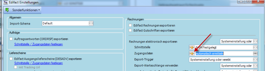 Hier wird über den gelben Pfeil im Feld Zugangsdaten das Fenster Schnittstelle / Zugangsdaten festlegen geöffnet.