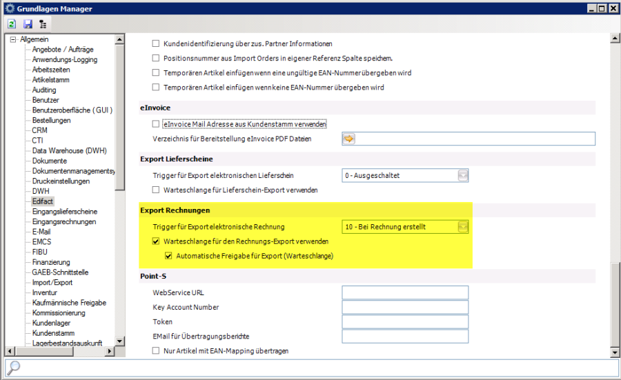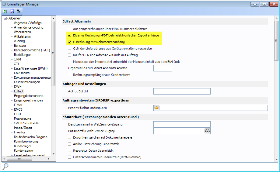 Weiters sind im Fenster Grundlagen Manager im Menüpunkt Edifact, im Unterpunkt Export Rechnungen zwei weitere Einstellungen relevant: