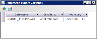 Vorschau | Wird eine Zeile markiert und im Menü der Menüpunkt Vorschau ausgewählt, wird ein neues Fenster Dokument-Export Vorschau geöffnet in welchem der Dateiname unter dem das Dokument exportiert wird, der Inhaltstyp (Dateityp) und die Kodierung (Zeichensatz) angezeigt. Mit Doppelklick auf die Datei kann diese im Standard-Programm geöffnet werden. Betätigt man in diesem Fenster das Symbol Versenden |