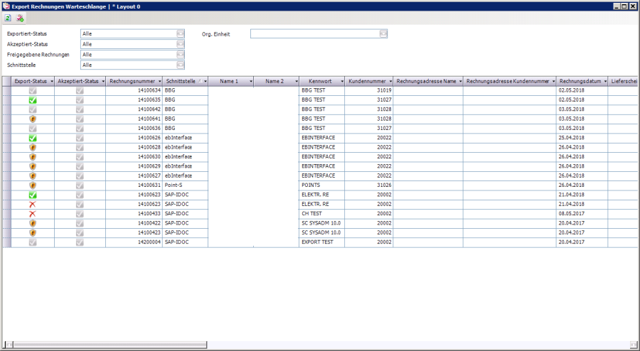Im Fenster werden beim Öffnen alle noch nicht exportieren, sowie fehlerhaften Rechnungen, die der Organisatorischen Einheit des Benutzers entsprechen, angezeigt. Dies ist die Standardeinstellung im Layout 0, diese kann allerdings angepasst werden. Die weiteren Funktionen des Fensters verbergen sich in einem Menü, welches durch Rechtsklick auf eine markierte Zeile aktiviert wird.