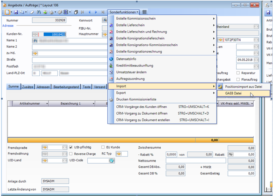 Unter dem Menüpunkt „Sonderfunktionen" – „Import" – „GAEB Datei" kann die entsprechende GAEB Datei ausgewählt und eingelesen werden.
