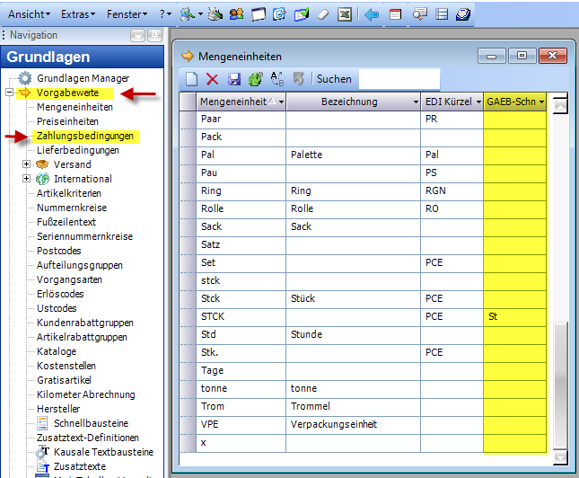 Die unter GAEB verwendeten Mengeneinheiten müssen im Fenster„Grundlagen" / „Vorgabewerte" / „Mengeneinheiten"in der Spalte GAEB-Schnittstelle hinterlegt werden.