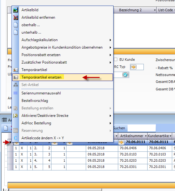 Die temporären Artikel können mit der Funktion „Temporäre Artikel ersetzen" direkt in den Positionen abgeändert werden.