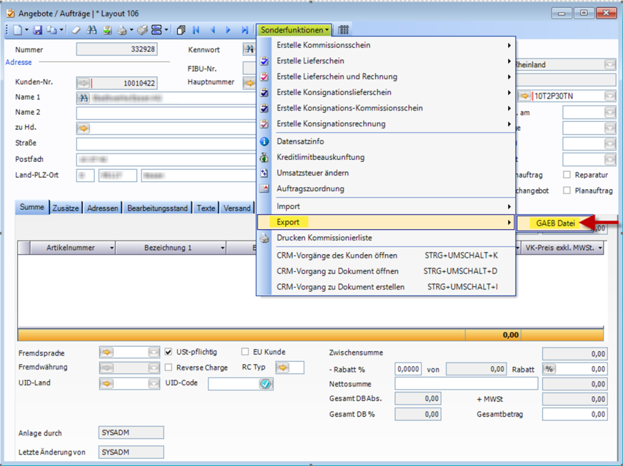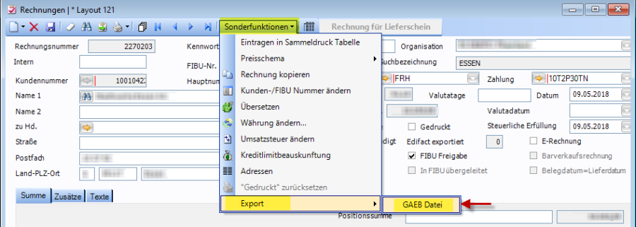 Unter dem Menüpunkt „Sonderfunktionen" – „Export" – „GAEB Datei" kann für die ausgewählte Rechnung die entsprechende GAEB Datei exportiert werden.