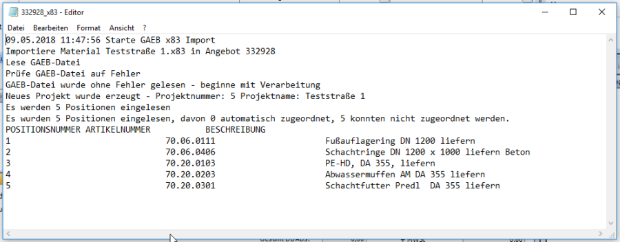 Nach Verarbeitung der GAEB Datei wird ein druckbarer und speicherbarer Report in einem Editorfenster angezeigt.