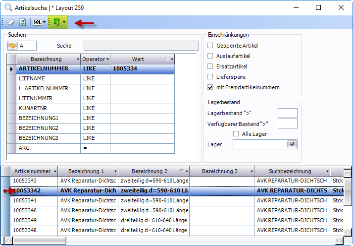 Durch Auswahl der Funktion „Artikelnummer ersetzen" öffnet sich das Fenster Artikelsuche.