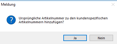 Beim Ersetzen des Artikels wird ein Meldungsfenster „Ursprüngliche Artikelnummer als kundenspezifische Artikelnummer in den Artikelstamm übernehmen?" (Ja/Nein) angezeigt.