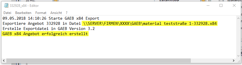 Nach dem Export der GAEB Datei wird ein druckbarer und speicherbarer Report in einem Editorfenster angezeigt.