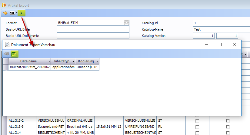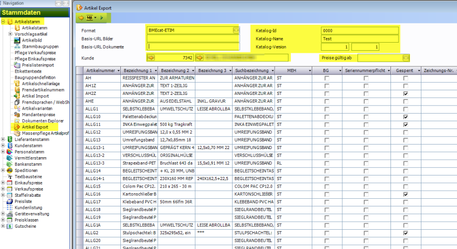 Format: Im Auswahlfeld „Format" muss BMEcat-ETIM ausgewählt werden. Basis-URL Bilder:Basis Pfad für Dokumentenbilder Basis-URL Dokumente:Basis Pfad für Dokumente Kunde: Auswahl des Kunden für den die BMEcat Liste erzeugt wird. Katalog-ID: Pflichtfeld - Wird im Exportfile übergeben (<CATALOG_ID>) Katalog-Name: Pflichtfeld - Wird im Exportfile übergeben (<CATALOG_NAME>) Katalog-Version: Pflichtfeld - Wird im Exportfile übergeben (<CATALOG_VERSION>) Kunden:Auswahl eines Kunden, für den das Export File erstellt wird. Preise gültig ab:Stichtag für die Preisberechnung; Wenn ein Kunde ausgewählt wurde, werden die Preise des Kunden zum ausgewählten Stichtag berechnet im Export File übertragen.