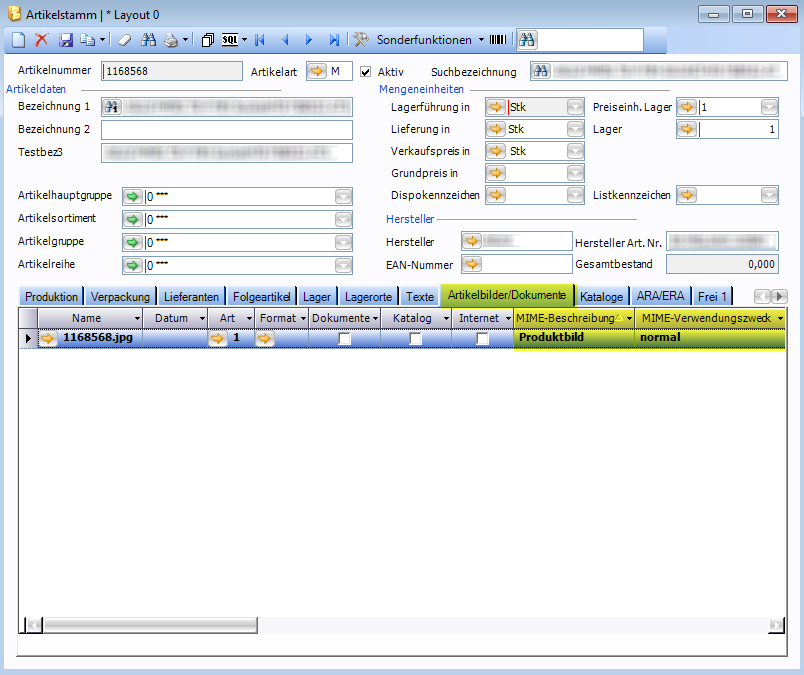 Für die zu exportierenden Bilder und Dokumente müssen die „MIME-Beschreibung" und der „MIME-Verwendungszweck" im Fenster ARTIKELSTAMM auf der Karteikarte „ARTIKEL/DOKUMENTE" definiert werden.Sind beide Werte bei einem Bild/Dokument befüllt, wird der Datensatz auch exportiert.
