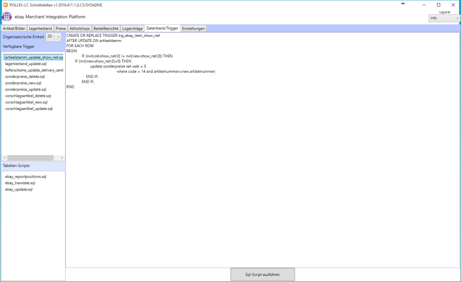 Als nächstes sind die nötigen Datenbanktabellen und Trigger anzulegen. Dazu gibt es bereits vorgefertigte SQL-Scripts die auf Ihr Unternehmen angepasst werden müssen. Dies betrifft z.B. Lagernummer oder Abrufcodes. Wählen Sie zuerst oben eine OE aus und klicken Sie dann auf die jeweiligen Tabellen bzw. Trigger.