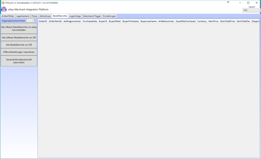 Wählen Sie dazu zuerst eine OE aus. Die Einstellungen dieser werden folgend verwendet. Zum herunterladen von Bestellungen wählen sie „Alle offenen Bestellungen von ebay herunterladen". Damit werden alle Auftragsdateien von ebay heruntergeladen und die Aufträge in die temporäre Tabelle importiert. Mit „Alle offenen Bestellbereichte von DB" und „Alle Bestellberichte von DB" erhalten Sie alle noch nicht importierten / alle Bestellbereichte in der temporären Tabelle für die ausgewählte OE. Mit „Offene Bestellungen importieren" werden alle noch nicht importierten Aufträge der ausgewählten OE in das Pollex importiert. Mit „Versand/Abholbereitschaft übermitteln" wird für alle Aufträge welche versendet sind (Lieferschein erledigt) bzw. Abholbereit (Abrufcode = „ABHOLBEREIT") und noch keine Meldung versendet wurde die Meldung an ebay übermittelt.