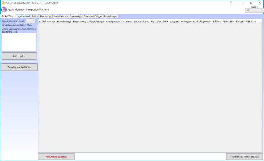 Zum Export der Abholshops wählen Sie eine OE aus dessen Konfiguration verwendet wird. Danach klicken Sie auf „Alle Abholshops updaten". Damit werden die Abholshops aus der Konfiguration exportiert.