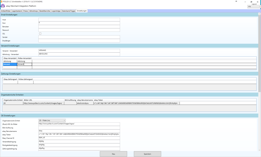 Um eine neue OE-Einstellung zu erstellen (Je ebay Konto muss mindestens eine OE Einstellung hinterlegt sein) klicken Sie unten auf Neu. Wählen sie die zu verwendende Organisatorische Einheit aus. Füllen Sie dann die Felder wie folgt aus. Um einen bestehenden Eintrag zu bearbeiten wählen sie Ihn oben in der Liste Organisatorische Einheiten aus. ACHTUNG es kann nur einen Eintrag je OE geben.