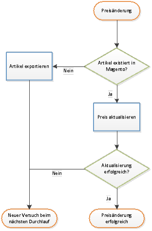 Der Artikelexport wird auch dann ausgeführt, wenn eine Preisänderung an den Magento-Shop über einen Artikel gemeldet wird, welcher nicht existiert. Das Schnittstellenprogramm exportiert dann umgehend alle fehlenden Artikel des Abgleichdurchlaufs. Der Magento-Shop kontrolliert jede Minute auf neue Dateien und importiert diese sofort.