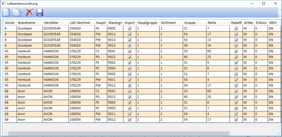 Hier kann/muss zu jeder Kombination aus Hersteller, Artikelhauptgruppe und Artikelgruppe ein Datensatz vorhanden sein. Wenn nicht, wird, wenn beim Import eine Kombination fehlt, der Import mit einem Fehler abgebrochen.