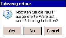 Ja/Yes: Die Rückmeldung wird durchgeführt. Nicht ausgelieferte Lieferscheine bleiben in der Fahrzeugbeladung erhalten, sodass diese bei der nächsten Ausfahrt nicht mehr extra gescannt werden müssen.