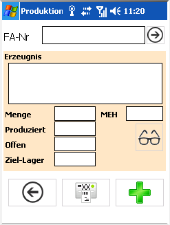 In diesem Feld wird die Fertigungsauftragsnummer gescannt/eingegeben - nach Bestätigung, wird der Fertigungsauftrag geladen und die Erzeugnis-Felder befüllt.