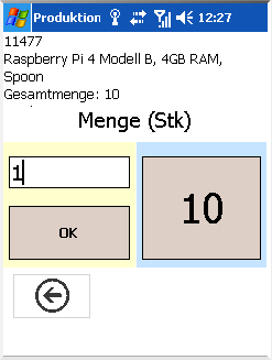 In dieser Funktion muss noch die produzierte Menge angegeben werden, welche im Ziel-Lager zugebucht wird. Das Feld "Produziert" wird dann um die angegebene Menge erhöht.