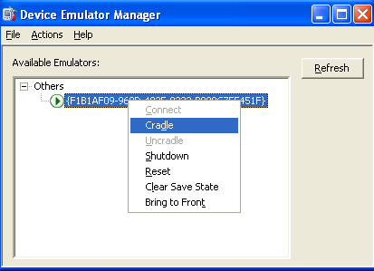 Klicken Sie mit der rechten Maustaste auf den gefundenen Emulator und wählen Sie „cradle". Damit wird vorgetäuscht, der Emulator befände sich in seiner Docking Station.