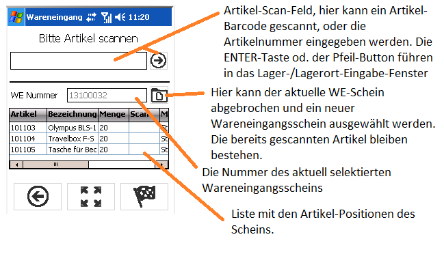 Ist der eingegebene Wareneingangsschein vorhanden und nicht durch einen anderen Benutzer gesperrt, können im nachfolgenden Fenster die Positionen gescannt werden.