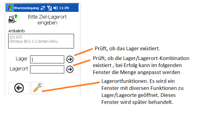Wurde ein Artikel eingegeben oder ein Barcode gescannt, wird im nachfolgenden Fenster der Lagerort und/oder wahlweise das Lager gescannt.