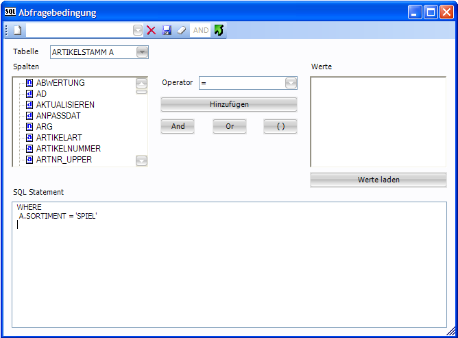 Beispiel: Das SQL Statement stellt eine SQL-Abfrage dar, die alle Artikel auswählt, die zum Artikelsortiment „SPIEL" gehören. Diese Abfrage soll unter dem Namen SPIEL gespeichert werden.