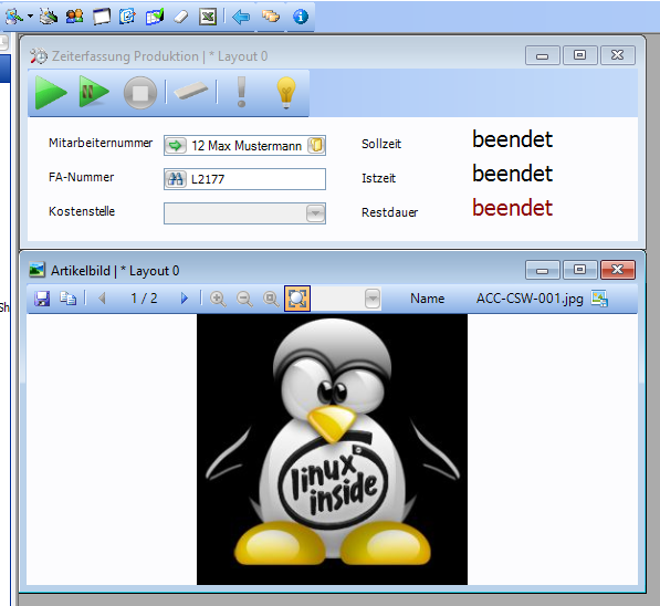 Hat ein Artikelbild einen Produktionsbereich hinterlegt, so wird dieses automatisch im Fenster "Artikelbild" angezeigt, wenn im Fenster "Zeiterfassung Produktion" eine Kostenstelle, welche dem gleichen Produktionsbereich zugeordnet ist, ausgewählt wird.