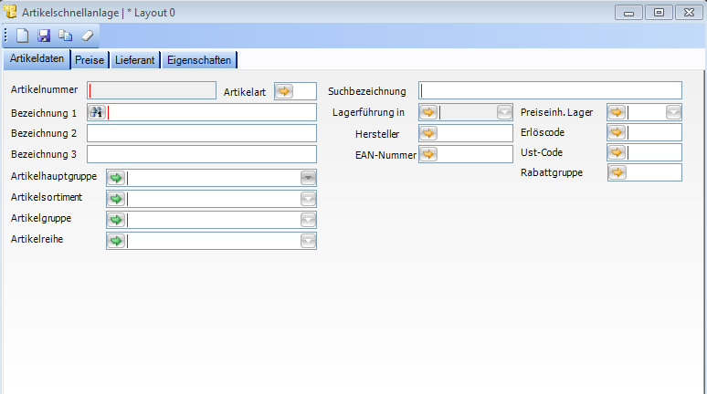 Die Felder und die Feldfunktionen im Fenster Artikelschnellerfassung entsprechen denen des Artikelstamms.