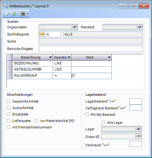 Im Fenster Artikelsuche können sämtliche Artikel nach spezifischen Kategorien gesucht werden, die einer bestimmten Suchkategorie zugeordnet sind.